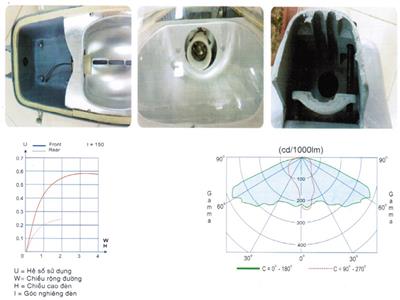 Chất liệu: Thân và nắp đèn bằng nhôm đúc áp lực cao, phản quang bằng nhôm, bề mặt sơn tĩnh diện, xử lý chống oxy hóa.