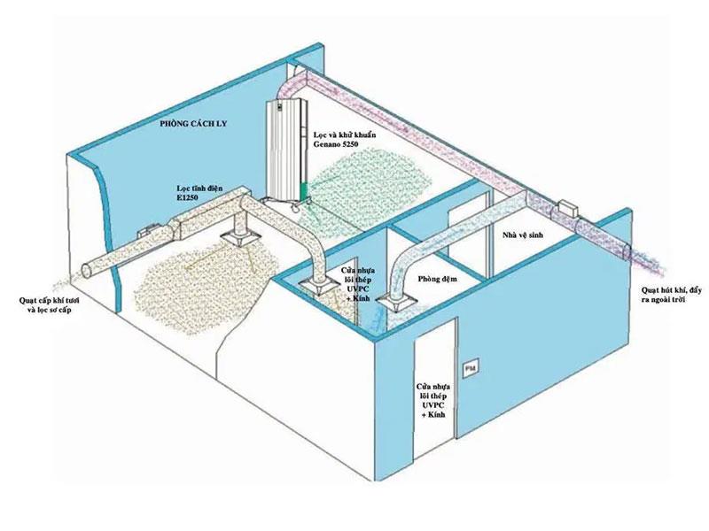 + Phòng cách ly phải gồm 2 lớp cửa kín khí để đảm bảo không khí nhiễm khuẩn không phát tán ra ngoài. 2 lớp cửa này hình thành 1 phòng đệm, đảm bảo đóng 1 cửa này rồi mới mở được cửa còn lại